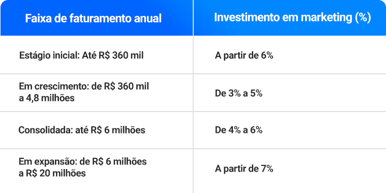 Por último, na quarta faixa, estamos falando de uma empresa que já está consolidada e em processo de expansão. Seguindo a evolução da nossa empresa de transportes, digamos que ela passou a faturar R$ 6 milhões anuais, ou R$ 500 mil mensais. Nesse caso, o investimento mínimo de 7% representaria cerca de R$ 35 mil reais mensais em marketing, um valor que pode contemplar ações online e offline mais robustas e diversificadas em diversos canais de comunicação.